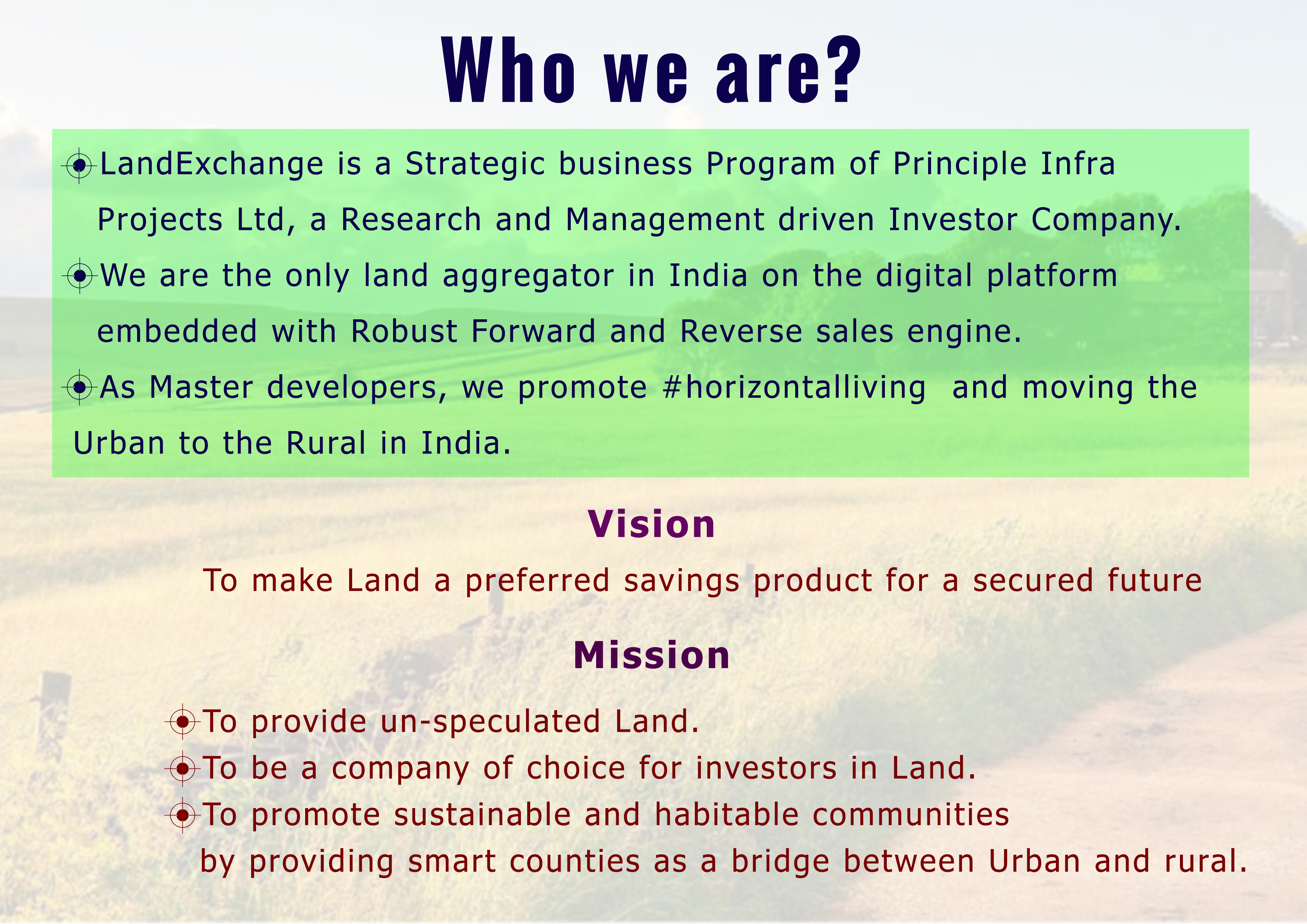 The company is a land banking, development & marketing company, associated with multiple land bankers & developers in India. Other than its own projects, the company also identifies unspeculated projects of other developers and offers these projects to the pre-booking clients of LandExchange.in
